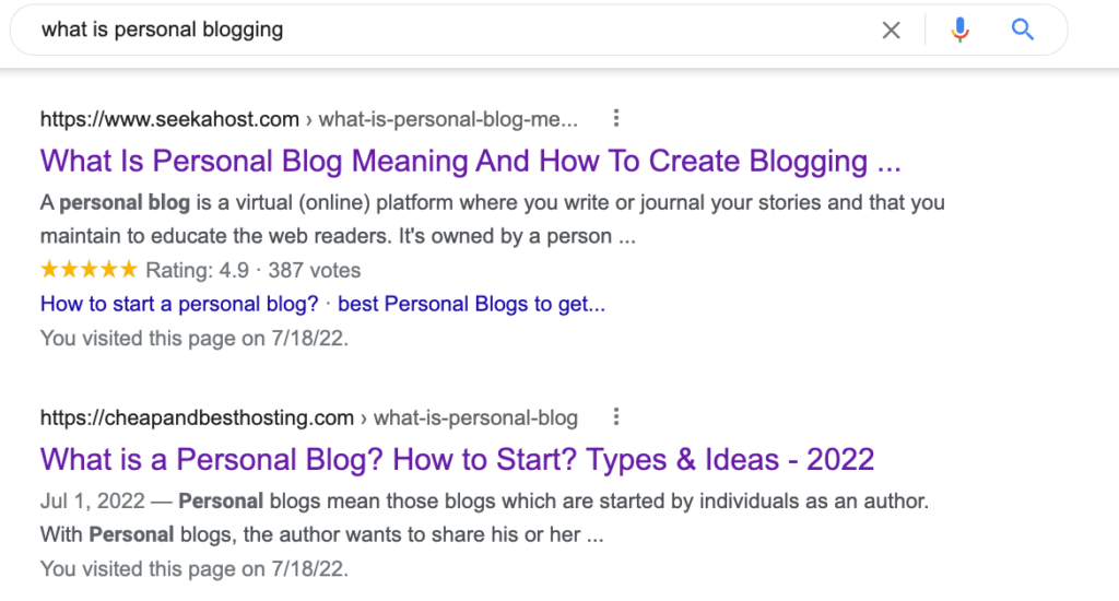 I see most of these top 10 articles on the SERP page for this topic of personal blogging are mainly concentrating on the Wikipedia definition of “a dairy on a digital platform written by one person, not a corporation or a business”. That is one of the few dynamics that define a personal blog. And I don’t see why almost all these articles have content related to starting a personal blog as personal blogs can range from WordPress to Instagram posts which in most cases are easy to make.