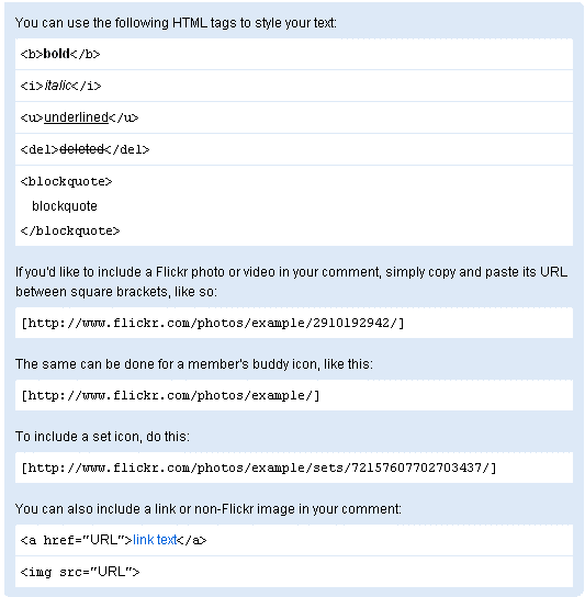 This addition to Flickr would improve its photo/video comments, since the basic HTML codes have been added as a formatting option in the comments section. This will enhance the topography of the comments and will attract many non-commentators which will ultimately push them towards commenting.
