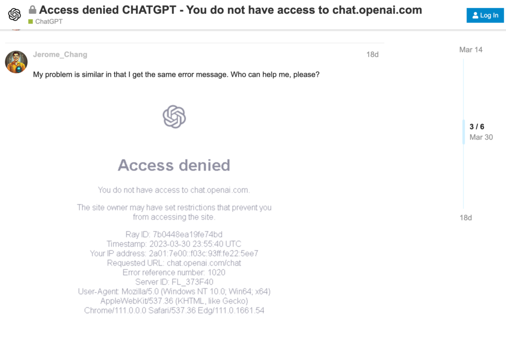 For instance, recently there was a problem with Chat GPT. Open Ai was giving “you don’t have access t chat.openai.com” error messages to some people. People started asking this question on chat forums on the Chat GPT.