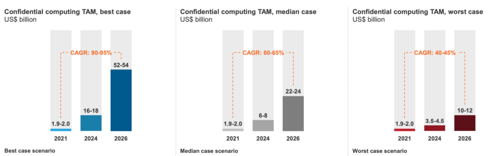 Like I mentioned earlier, the market value of $2 billion in 2021 is set to see exponential growth to reach around $52 billion in the best-case scenario. In numbers, this is 26 times growth in five years. Source: ConfidentialComputing.io